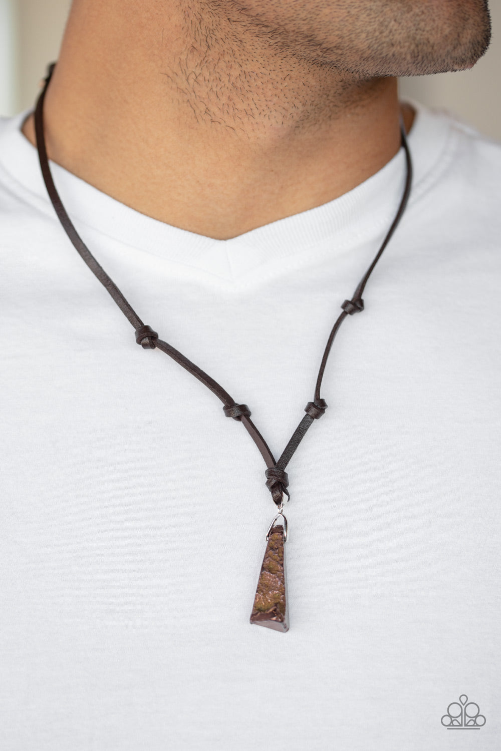 A raw piece of coppery hematite swings from the bottom of a knotted black leather strand, creating an earthy urban pendant. Features an adjustable sliding knot closure.